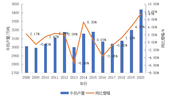 牛奶产量增幅创10年来新高,奶制品加工量增加。2020年,在奶业振兴的大背景下,奶牛存栏量企稳回升,奶牛单产量持续增加,奶类产量大幅度增长,奶类产量和牛奶产量均创10多年来最高增幅,为2008年以来的最高点。据测算,全年奶类产量达到3 546万吨,其中牛奶产量3 440万吨,同比增7.5%(图1)。奶制品产量继续增长,加工区域集中。2020年,全国奶制品产量为2 780.38万吨,同比增长2.8%。其中,液态奶产量2 599.43万吨,同比增3.3%;干乳制品产量180.95万吨,同比减少3.1%;干乳制品中,奶粉产为101.23万吨,同比减少9.4%。