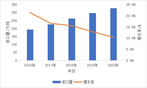 奶制品总消费量和人均消费量增长明显。全年奶制品消费量达到5354万吨,同比增长8.4%,人均奶制品消费量达到38.11千克,比2019年增加2.8千克。在多样的奶制品中,低温奶继续保持扩张增长态势,奶制品的消费结构正在发生转变。奶制品贸易量继续增长,乳清粉进口增幅最大。2020全年进口奶制品为328.12万吨,同比增长10.4%,增速继续放缓(图2);进口额117.06亿美元,同比增长5.2%。奶制品出口量4.29万吨,同比减少21.0%;出口额2.22亿美元,同比减少49.0%。液态奶进口量为107.19万吨,同比增长16.0%;干乳制品进口量220.93万吨,同比增长7.8%。其中,乳清粉进口大幅增长,全年进口量达到62.64万吨,同比增长38.2%。奶制品进口来源地主要集中在新西兰、欧盟、美国、澳大利亚和白俄罗斯等国家和地区。