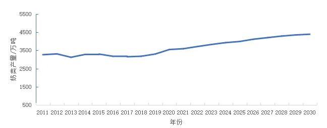 未来10年,生鲜乳产量将稳步提高,规模养殖比重不断增长。展望期间,随着奶业振兴行动全面实施,奶源基地建设将持续推进,奶业生产技术普遍提升。2021年,奶类产量将达到3 591万吨,比2020年增长1.3%;2025年,奶类产量达到3 989万吨,年均增长2.3%;2030年,预计100头以上奶牛规模养殖比重将达到80%,泌乳牛单产水平将突破10吨,奶类产量达到4 389万吨,年均增速2.3%。奶制品消费量继续增长,消费结构明显转变。展望期间,随着70后和80后健康意识逐步增强以及90后和00后奶制品消费习惯的养成,奶制品消费群体不断扩大,消费量将快速增长。预计2021年,奶制品消费量将达到5 462万吨,同比增长2.0%;2025年,消费量达6 207万吨,年均增长3.0%。到2030年,消费量将达到6 933万吨,年均增速2.7%;人均消费量达47.90千克,年均增长2.3%;低温奶制品和奶酪增长明显。奶制品进口持续增加,增幅逐渐趋缓。展望期间,国内奶制品消费量将快速增长,生鲜乳缺口长期存在,奶制品进口继续增加。预计2021年,奶制品进口量折合生鲜乳1 886万吨,同比增长3.5%;2025年,奶制品进口量折合生鲜乳将达到2 235万吨,年均增长4.2%;到2030年,奶制品进口量折合生鲜乳将达到2 563万吨,年均增速3.5%,明显低于过去10年(2011-2020年,下同)9.9%的年均增速。展望期间,新西兰、澳大利亚、欧盟仍为主要的进口来源国家和地区。生鲜乳价格将维持高位水平。未来10年,受奶制品消费增长的带动,生鲜乳需求将持续旺盛,加之成本上升的支撑以及低温奶制品的快速发展,生鲜乳质量分级、优质优价体系将逐步形成,生鲜乳价格将保持高位水平。预计2021年,生鲜乳年均价格比2020年上涨7%~11%。奶业产量将继续增长。未来10年,在奶业振兴政策的持续推动下,奶源布局逐步优化,特色奶类增产潜力得到挖掘,奶牛养殖在种、料、病和管等各方面将取得较大进展,生鲜乳产量将继续增长。预计2021年,随着奶源基地建设的继续推进,全年奶类产量将达到3 591万吨,同比增长1.3%;到2025年,奶类产量达到3 989万吨,年均增长2.3%。展望后期,奶业基础稳定夯实,奶业生产技术水平普遍提升,机械化、信息化和智能化水平不断提高,预计到2030年,奶类产量将达到4 389万吨,年均增长2.3%,显著高于过去10年0.9%的增速(图3)。