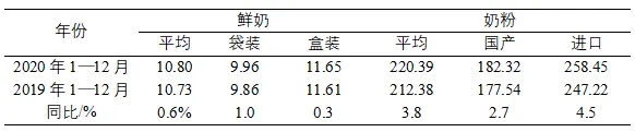 生鲜乳收购价格波动上涨,主要奶制品零售价格稳中略涨。据农业农村部统计,2020年生鲜乳年均价格为3.79元/千克,同比上涨3.8%。城市鲜奶零售价格稳中略涨。根据中国价格信息网监测,2020年,全国监测城市鲜奶平均零售价10.80元/千克,同比上涨0.6%。三段婴幼儿配方牛乳粉平均零售价格220.39元/千克,同比上涨3.8%。 表1 2019—2020年中国鲜奶和奶粉零售价格变化