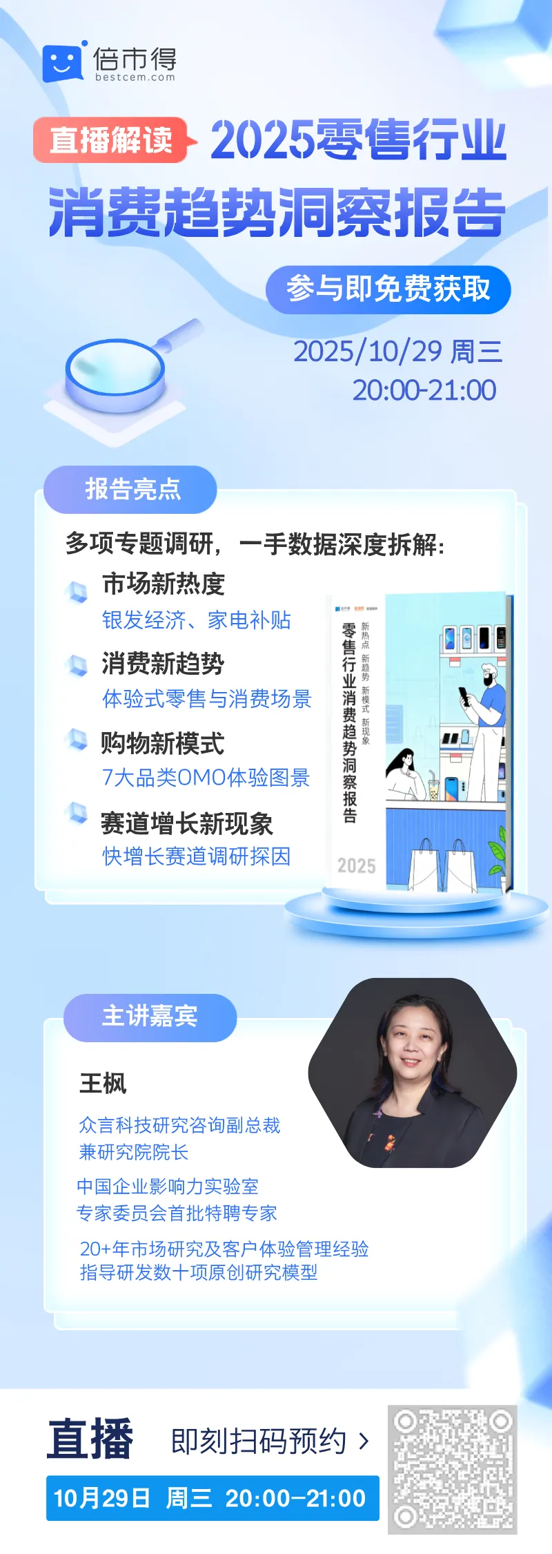 即刻扫描下方二维码预约直播,了解 2025 年零售行业的变与不变,把脉消费需求重构下的新机遇!10月29日(周三)20:00-21:00 倍市得为您带来最新《2025 零售行业消费趋势洞察报告》直播解读,我们不见不散!
