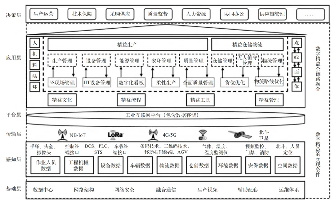 该架构分为三大部分:数字精益的实现条件、数字精益全链路融合、数字精益支持的决策层。为实现上层数字精益全链路融合并辅助决策,首先需要具备基础条件。数字精益的实现条件涵盖了数字化转型架构中的基础层、感知层、传输层及平台层。基础层主要搭建上层数字精益实现的IT基础设施,感知层核心是为上层的数据获取奠定基础,传输层则是数据流入应用层中各功能系统的通道,平台层是承载数据及上层应用的基础。在数字精益的实现条件搭建完备之后,在应用层中,将精益文化、精益流程、精益工具、精益管理思想,融合到企业日常生产管理业务中,从人、机、料、法、环的各业务方面出发,在点、线、面、体多维度上帮助生产效益的提升,并最终达到辅助决策的目的。