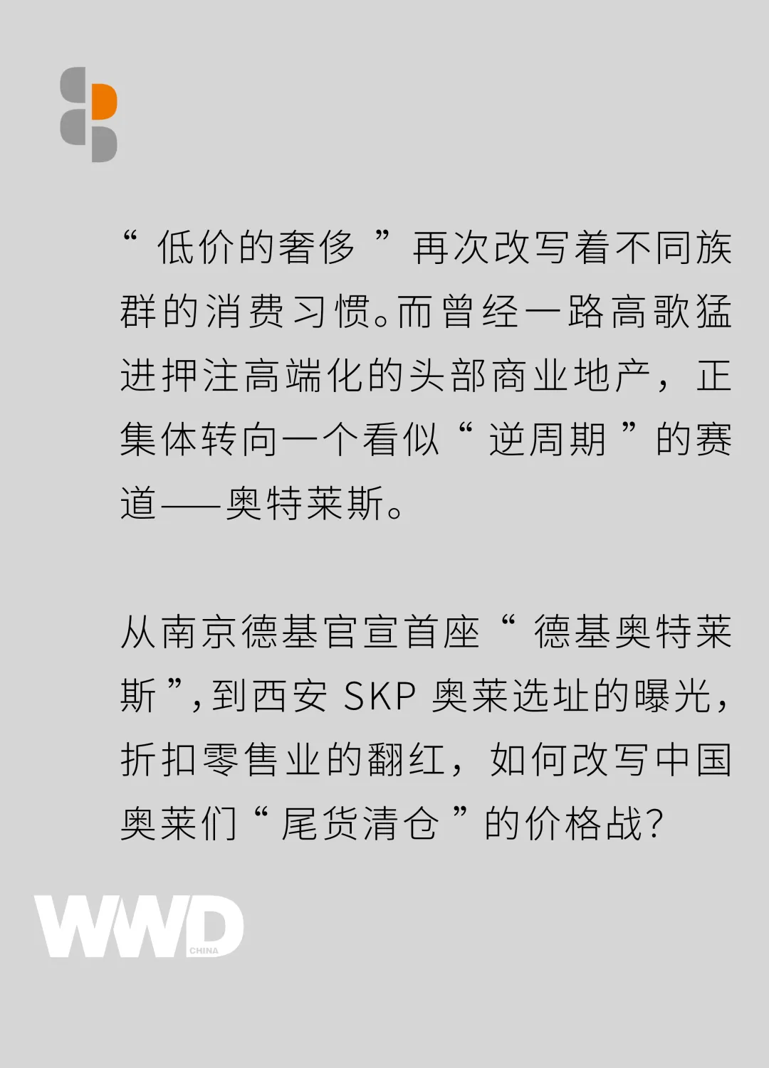 在此背景下,折扣零售业的特殊价值却被重新激活,它既能通过“折扣”激活价格敏感型客群,又能通过复合型业态和差异化体验守住核心客群。因此,对高端商业地产而言,进军奥莱或已不再是一个“可选项”。