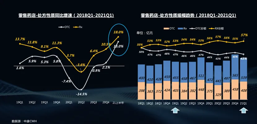 中康CMH数据显示,2021年上半年处方药和OTC均实现快速增长,增速分别为18%、15%。在处方外流持续加速的背景下,零售处方药占比持续提升,2021年上半年达到57%。