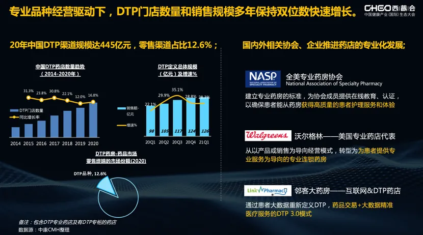 从专业经营层面,2020年中国DTP市场销售规模达445亿元,占整体药品零售终端的12.6%。包含DTP专业药店及有DTP专柜的药店门店数量及总体销售规模均持续双位数快速增长。此外,国内外相关协会、企业均在积极推进药店的专业化发展。