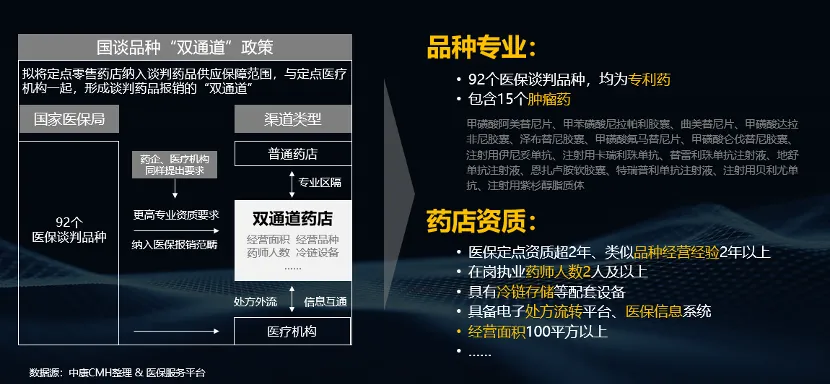 2021年5月发布国家医保谈判药品“双通道”政策,将创新药纳入,更是对药店专业运作提出了更高的专业要求。地方医保局对各地“双通道”药店作了明确要求,如:医保定点资质超2年、类似品种经营经验2年以上;在岗执业药师人数2人以上;具有冷链存储等配套设备;具备电子处方流转平台、医保信息系统;经营面积100平方以上;具有与双通道药品一级代理商或厂家的供应合同等……