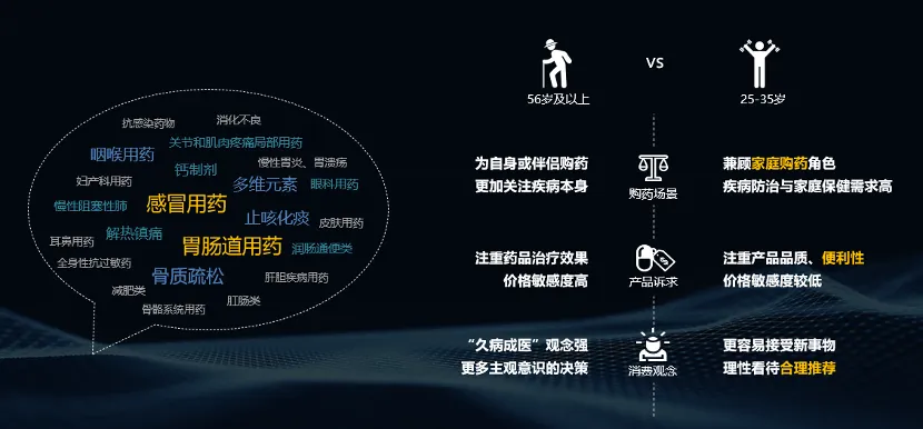 随着处方药市场进一步细分,不同人群对于药品选择和专业服务的需求不尽相同,例如,在常见疾病领域,不同年龄段的患者的场景、诉求、观念存在差异。即使同样药品类型,不同年龄段的诉求也不一样:以高血压为例,中老年人更倾向选择疗效好、实惠、专业推荐,而年轻人群注重品质、对价格敏感度较低。