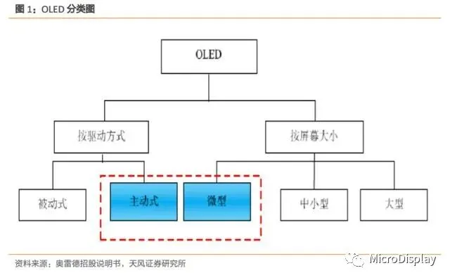 OLED 按屏幕大小可以分为大尺寸、中小尺寸和微型显示器;按照基板的不同可以划分为玻璃基板、硅基板、柔性基本等。由于 PPI 的差异,微型尺寸的 OLED 显示器一般使用硅基板,而中小尺寸、大尺寸 OLED 通常选用玻璃基板或柔性基板。