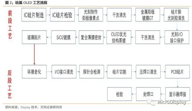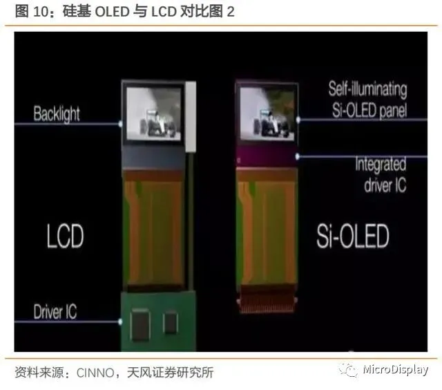 硅基 OLED 技术优势。硅基 OLED 集电子技术、光学技术、材料技术、半导体技术等于一体,除具有 OLED 自发光、响应速度快、工作温度范围宽、全固态等特点外,还具有体积小、重量轻、功耗低、PPI 高等特点,主要用于近眼式显示系统,是近眼式显示系统的核心器件。