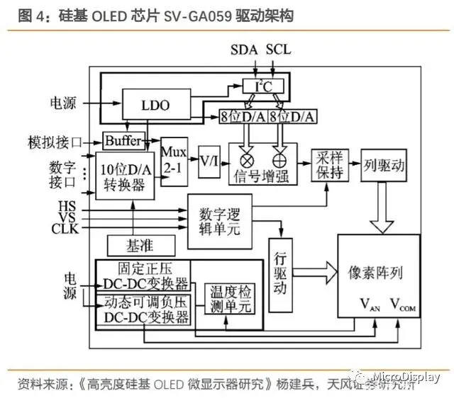 硅基 OLED 驱动芯片架构。SVGA059 驱动芯片采用标准 CMOS 工艺设计,驱动背板包括像素电路、行列驱动电路、D/A 转换器、三路电源模块、I2C 接口、温度传感器等。芯片中同时集成了温度传感模块,实现芯片在高低温下的精确调节,提高芯片显示的稳定性。