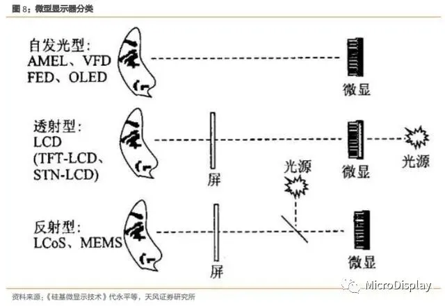 目前微显示技术主要包括高温多晶硅液晶显示技术(HTPS-LCD)、硅基反射式液晶显示技术(LCOS)、硅基 OLED 显示技术(Micro OLED)和硅基 LED 显示技术(Micro LED)等。HTPS-LCD、LCOS 等为被动式显示技术,存在体积大、光路复杂等问题。Micro LED 显示技术成熟度较低,需要进一步解决 LED 微型化和与驱动背板组装等问题,目前还没有实现工程化应用。