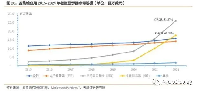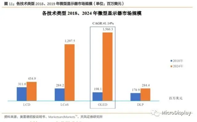 根据市场研究机构 MarketsandMarketsTM的研究报告,OLED 微型显示器市场规模增长最为迅速,年均复合增长率达到 41.14%,预计 2024 年将实现 1566.3 百万美元的市场规模,并最终超过 LCD 与 LCoS 成为微型显示器应用最为广泛的技术类型。未来的 MicroOLED 显示器将达到 4k x 4K 的分辨率,亮度超过 5000cd/m2,大批量生产价格约为今天的 15%。