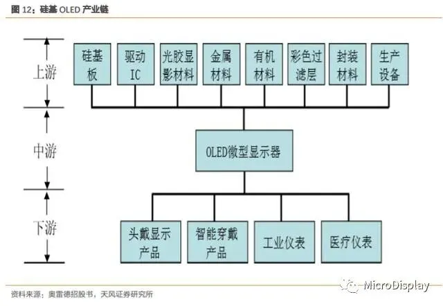 硅基 OLED 产业链包含上游原材料,中游 OLED 面板制造以及下游 OLED 应用等环节。上游包括硅基板、驱动 IC、光胶显影材料、金属材料、有机材料、彩色过滤层材料、封装材料、生产设备等主要环节,为中游 OLED 微显示器厂商提供原材料和设备。中游厂商制造显示面板后,其产品可应用于头戴显示产品、智能穿戴产品、工业仪表、医疗仪表等下游应用产品中。