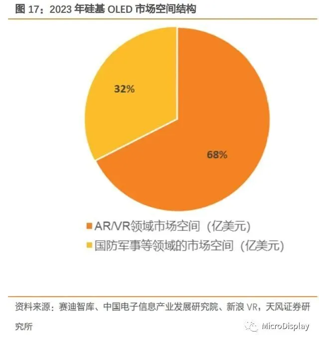 硅基 OLED 应用场景从军用逐渐转向民用。硅基 OLED 具备制造良率较高、性能稳定、寿命较长、体积小、低功耗等特性,进而促进其成为头盔显示器、立体显示镜以及眼镜式显示器等可穿戴显示的主要方案。其能够为便携式计算机、无线互联网浏览器、便携式 DVD、游戏平台及可穿戴式计算机等一共信息产品提供高画质的视频显示,在 R/AR、工业安防、医疗等高分辨率近眼显示领域都能有广泛的应用,逐渐成为新型显示行业的角力点。