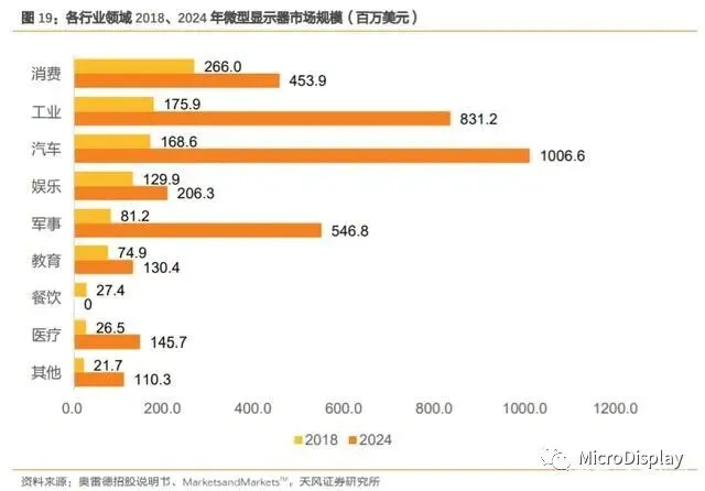 军事用途将成为微型显示器市场规模增长最为迅速的领域。根据 MarketsandMarkets TM 的研究报告,2018 2024 年,军事用途将成为微型显示器市场规模增长最为迅速的领域,年均复合增长率达到 37.42%,预计 2024 年将实现 546.8 百万美元的市场规模。