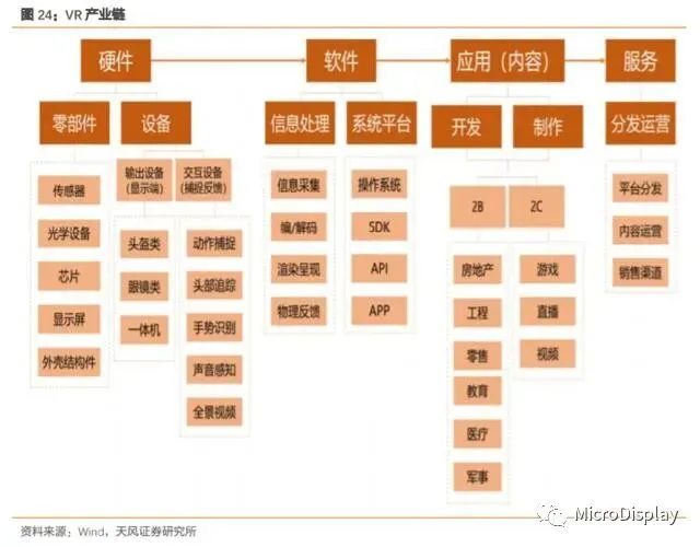 目前,虚拟现实应用可分为行业应用和大众应用,行业应用主要分为 B2B、B2C。B2B:零售、房地产、医疗健康、工业制造;B2C:电视游戏、赛事直播、视频娱乐、通讯及社交,虚拟现实应用正在加速向生产与生活领域渗透,“VR/AR+”的时代业已开启。