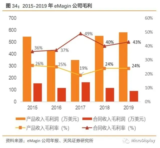 eMagin 产品收入稳增,合同收入略减。公司产品收入从 2018 的 2330 万美元增长到 2019年的 2460 万美元,同比增长 5%,主要原因系客户需求以及出货量的增长。同时,合同收入从 2018 年 290 万美元减少至 2019 年的 210 万美元,减少 27%,主要原因系 2018 年年初完成几份商业和美国政府的研发合同。合同毛利率取决于内部第三方成本和外部第三方成本的混合,2019 年合约收入毛利减少主要是由于合同收入减少。
