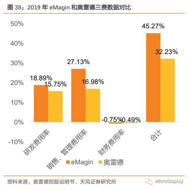 奥雷德营收不敌 eMagin,三费管控到位。eMagin 营业收入规模较公司高,但由于经营成本费用过高、持续亏损,未弥补亏损较高导致 eMagin 总资产、净资产规模较小。2019 年eMagin 可比业务毛利率相比较低,主要系 eMagin 位于美国,其人力成本较高所致。