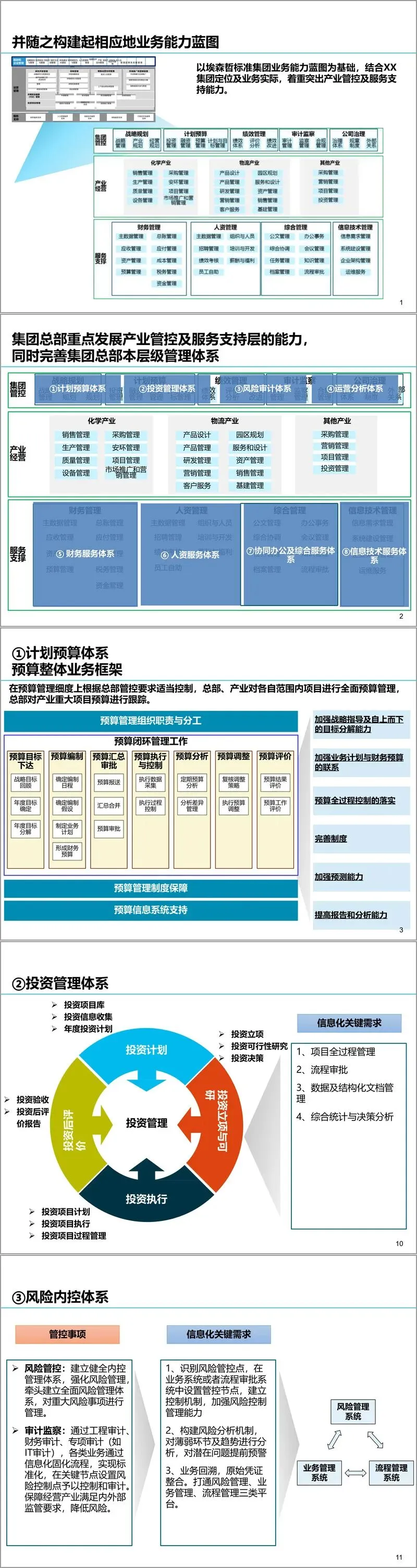 方案开篇明确集团面临的战略与管理双重挑战,提出集团总部向以产业投资为核心的六大平台转型,包括服务共享、文化融合、风险控制、资源配置、战略发展、运营分析平台,同时明确产业板块集约化发展与专业化运营的定位。基于埃森哲标准业务能力蓝图,方案梳理出集团总部需重点强化的产业管控及服务支持能力,涵盖计划预算、投资管理、风险审计、运营分析、财务服务、人资服务、协同办公及信息技术服务八大核心体系。
