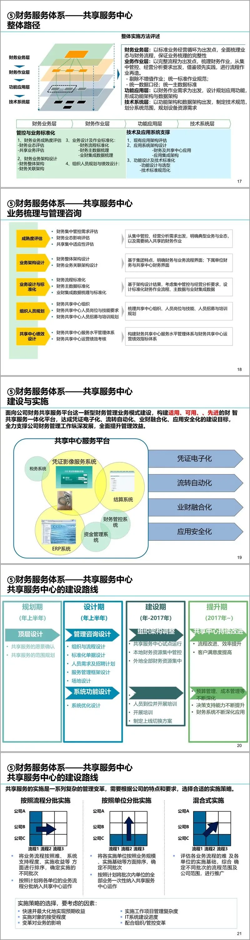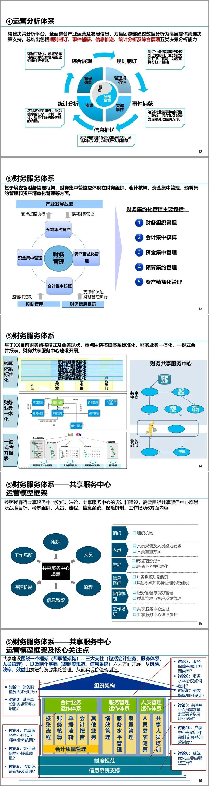 在业务架构设计上,各体系均形成闭环管理机制。计划预算体系实现从战略目标分解到预算评价的全流程管控,总部与产业分层负责项目预算管理;投资管理体系构建项目全生命周期管控,涵盖项目库建设、立项可研、执行监控及后评价;风险内控体系通过设置管控节点、构建分析机制及打通三类平台,强化风险预警与合规管理;运营分析体系聚焦规则制订、事件捕获等五类决策分析能力,为高层决策提供数据支撑。财务服务体系以集中管控为核心,推进核算标准化、业财一体化及财务共享服务中心建设;人资服务体系通过共享中心模式,实现组织、招聘、培训等全流程标准化管理,提升人力资源利用效率。