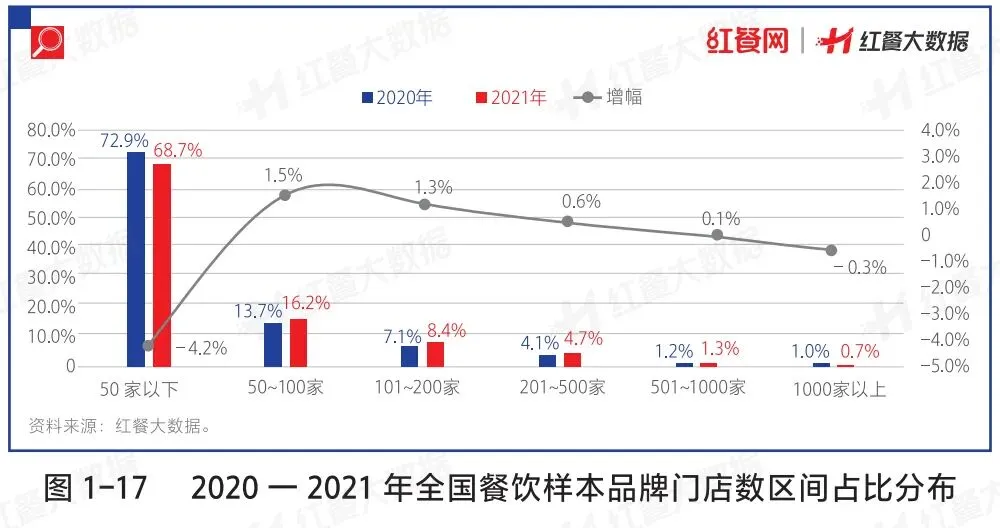 在餐饮市场的持续洗牌下,餐企的连锁化进程在逐渐加快。红餐大数据显示,2021年餐饮品牌平均门店数量整体有上升趋势。一方面可能是由于部分品牌本身的品牌力不强而被淘汰出局,另一方面或是由于部分品牌逆势扩张,实现了门店数量的进一步增长。