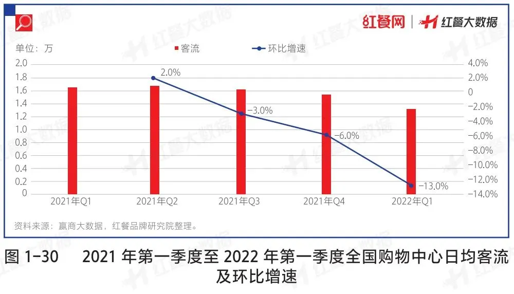 疫情之下,各地购物中心的客流受影响较大。进入2022年,全国购物中心的日均客流总体水平仍呈下降趋势。数据表明,自2021年第二季度以来,全国购物中心日均客流从2021年第二季度的1.7万人的峰值降至 2022 年第一季度的1.36万人。此外,全国购物中心日均客流量的环比降幅不断扩大,2022年第一季度环比降幅达到了13.0%。