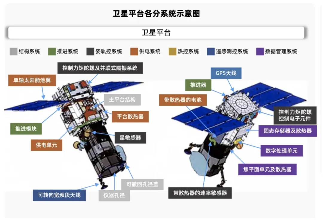 卫星平台的主要功能是保障卫星和有效载荷在空间正常工作的系统,包括控制、推进、结构等多个分系统。