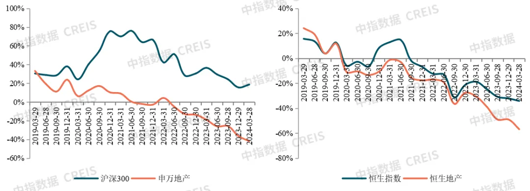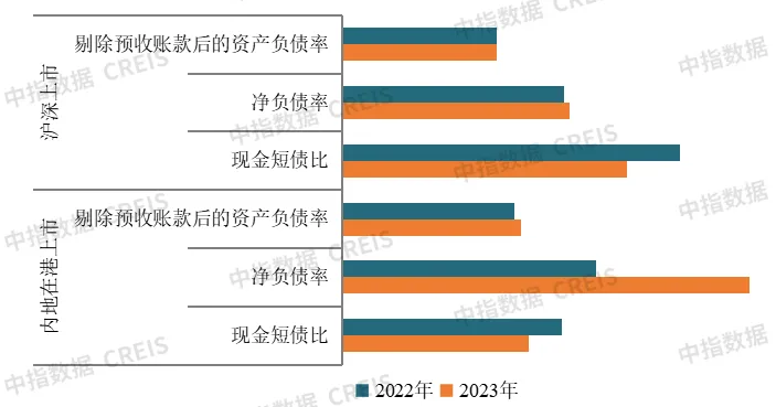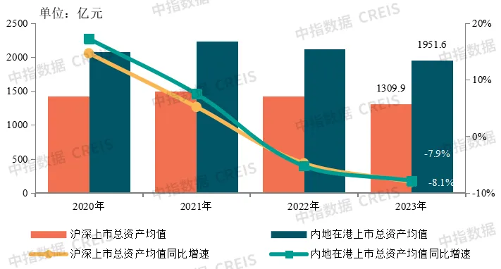 2023年,房地产上市公司收入规模阶段性上升,净利润持续下滑,流动性有所恶化,且企业间经营规模、财富创造力和财务稳健等方面的表现持续分化。未来新房市场将缓慢复苏,行业将加速出清、重整,未来拥有良好基本面、核心业务开发经营优势、聚焦高能级城市的房地产上市公司将释放更高的企业价值。企业研究:https://www.cih-index.com/2023年,房地产上市公司总资产规模连续两年负增长,降幅扩大。其中,沪深上市房地产公司总资产均值为1309.9亿元,较上年下降8.1%,降幅较上年扩大3.3个百分点。内地在港上市房地产公司总资产均值为1951.6亿元,较上年下降7.9%,降幅较上年扩大2.6个百分点。沪深及内地在港上市房地产公司总资产连续两年负增长,行业持续缩表。行业缩表主要源自民营和混合所有制房企缩表,央企资产规模与上年基本持平,地方国企资产规模小幅增长。2023年,房地产市场仍在深度调整周期,上市房企主动收缩投资规模,加快竣工结转,年末存货规模下降,受销售下降和融资受限影响,货币资金规模连续两年下降,上市房企降低权益性投资规模,适度提高持有性物业规模,适应房地产发展新阶段要求,推动总资产规模有序下降。企业研究:https://www.cih-index.com/2023年,沪深及内地在港上市房地产公司竣工结转加速,营收增速较上年明显回升,净利润继续下滑。其中,剔除异常值后,沪深上市房地产公司营业收入均值为273.5亿元,同比增长2.1%;内地在港上市房地产公司营业收入均值为396.1亿元,同比增长5.0%。沪深、内地在港上市房地产公司净利润均值分别为3.0亿元、-21.3亿元,同比下降,降幅有所收窄。过去几年销售额增速逐年下滑,2023年上市房企结转规模因前期积累较高且上年下滑过快后出现反弹,其增长可持续性有限,结转收入规模短期内维持下行趋势。同时,近两年市场持续调整,短期内对销售毛利率形成较大压力,随着这部分销售资源逐步转入竣工交付,短期内结转业绩承压。2023年,上市房企净利润率均值、净资产收益率均值为负。沪深、内地在港上市房地产公司净利润率均值分别为-0.8%、-24.0%,较上年下降。2023年沪深及内地在港上市房地产公司三道红线情况企业研究:https://www.cih-index.com/2023年,行业继续在调整期运行,沪深上市公司及内地在港上市公司负债率均有所上升。沪深及内地在港上市房地产公司净负债率均值为91.2%、163.1%。短期偿债能力持续下降,沪深及内地在港上市房地产公司现金短债比均值分别为1.14、0.75。上市公司流动性出现明显分化,头部央国企及部分稳健型民企持续优化债务结构,负债率下降;部分民企和混合所有制企业由于存量债务到期、再融资不足导致债务压力加大。2019-2024年一季度房地产板块与大盘涨跌幅度变化情况1企业研究:https://www.cih-index.com/