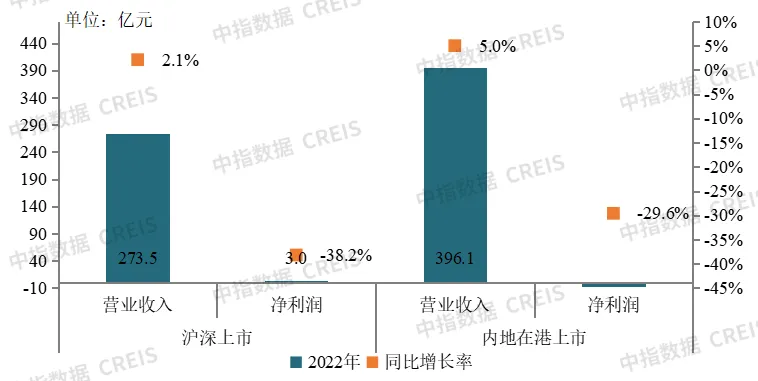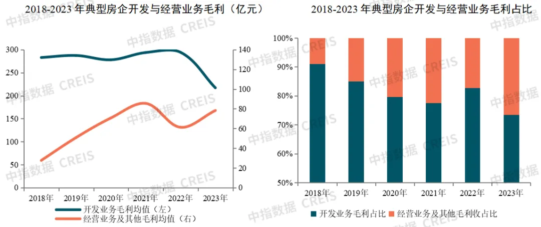 2023年,房地产板块持续走低,沪深及内地在港房地产上市公司表现整体不如大盘。2023年A股市场经历了较大波动,年末沪深300同比下跌11.4%,2023年年末申万地产指数同比下降26.4%。港股市场在2023年的整体走势延续了2022年的弱势、在震荡中持续走低,2023年年末恒生指数同比下降13.8%,港股房地产板块整体随大盘波动,恒生地产指数同比下降29.6%。房地产上市公司估值承压,新房市场延续调整态势,投资者将更加关注企业可持续运营能力和长期价值,保持稳健运营、展现出拿地能力、经营性业务较强的企业更易获得投资者的青睐。探索新发展模式,代表房企总体上均采取“开发+经营”为模式的轻重并举发展策略,代表房企往往采用“住宅开发/重资产+X”的方式,其中X代表运营与服务类业务,包含购物中心、写字楼、酒店、长租公寓、代建、装饰、展览、康养等业务领域。房企构建新发展模式初现成效,经营性业务业绩增长快于开发业务,重要性日益凸显。从业务规模看,典型房企2经营性业务营收在2018年至2023年之间年复合增长率达到21.0%,增速比开发业务高出6.4个百分点。同时,较高的增速也使经营业务在企业整体营收中的占比呈现上升态势。从利润来看,开发业务毛利下滑,经营业务利润贡献度凸显。2018年至2023年,典型房企毛利中来自经营业务的占比从8.9%增长到26.5%。 企业研究:https://www.cih-index.com/注2:典型房企包括:中国海外发展、华润置地、绿城中国、招商蛇口、龙湖集团、建发国际集团、中国金茂、金地集团、新城控股、越秀地产。