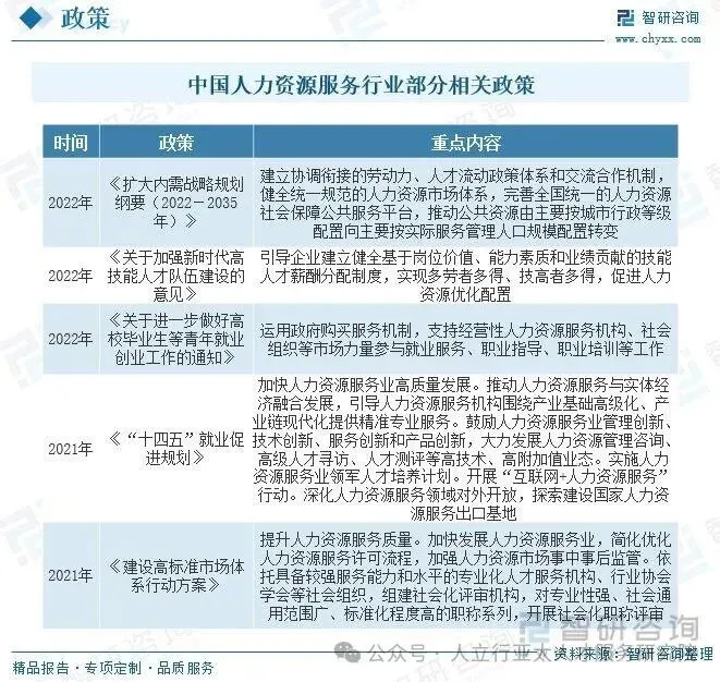 近些年来,为了促进人力资源服务行业的发展,我国陆续发布了许多政策,如2022年中共中央国务院发布的《扩大内需战略规划纲要(2022-2035年)》建立协调衔接的劳动力、人才流动政策体系和交流合作机制,健全统一规范的人力资源市场体系,完善全国统一的人力资源社会保障公共服务平台,推动公共资源由主要按城市行政等级配置向主要按实际服务管理人口规模配置转变。