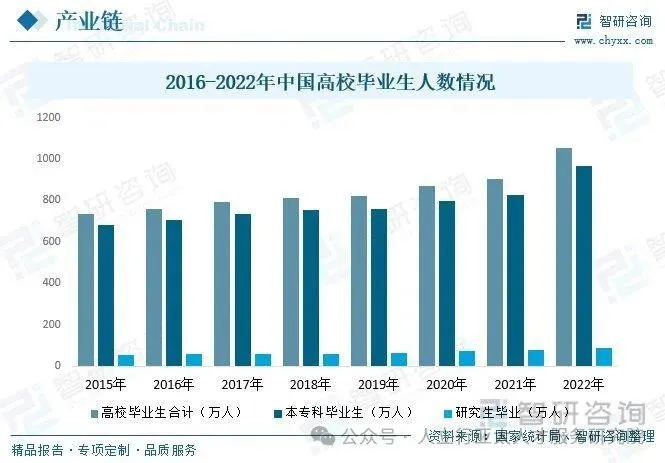 从行业上游方面来看,求职者是人力资源行业最主要的上游群体,其中高校毕业生是其中重要组成部分。随着近年来我国教育行业规模的不断扩张,我国高校毕业生人数也随之不断增长。据资料显示,2022年我国高校毕业生总人数为1053.5万人,同比增长16.6%。其中本专科毕业生967.3万人,同比增长17%;研究生毕业86.2万人,同比增长11.5%。