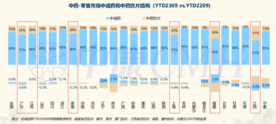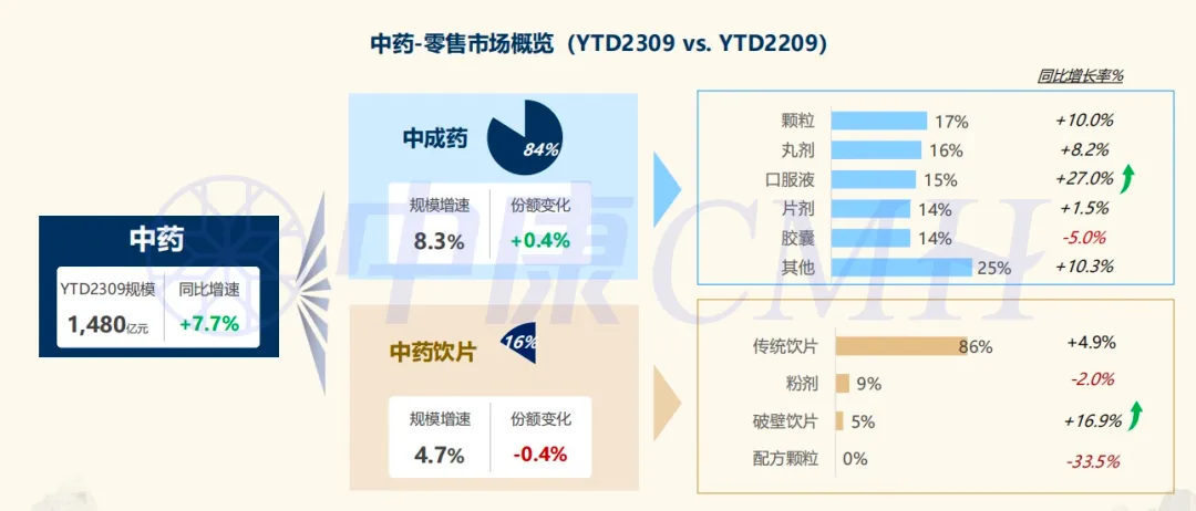 中康CMH数据显示,YTD2309中药零售市场规模达1480亿元,同比增长7.7%,其中,中成药增速(+8.3%)快于中药饮片(+4.7%),中成药的口服液、中药饮片的破壁饮片增长亮眼。