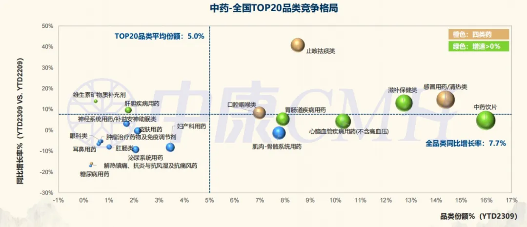 从细分品类上看,中成药中,四类药增长趋势显著,滋补保健、心脑血管、胃肠道、肝胆用药规模呈上升趋势;中药饮片占比最高,保持正增长。