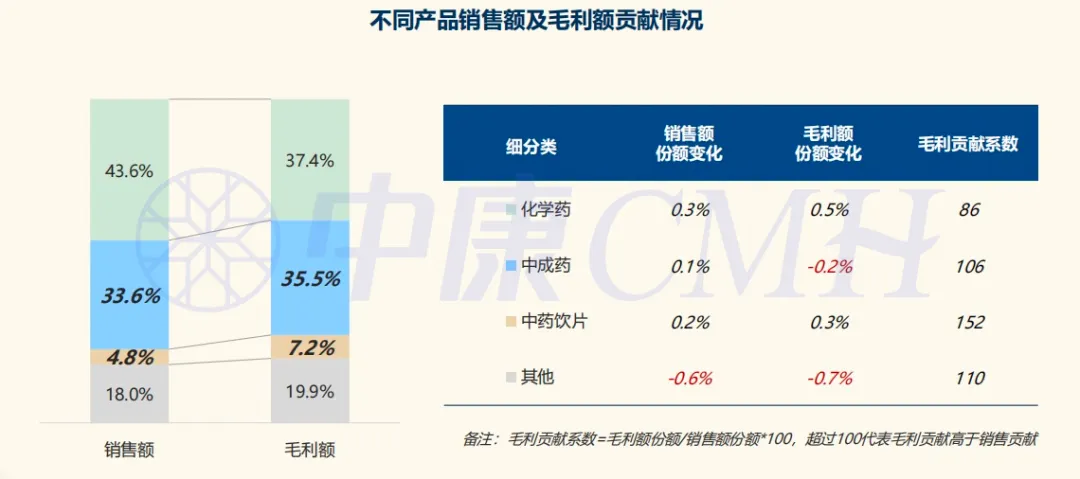 而在利润压缩的背景下,中药仍能保持较高的毛利水平,中药饮片的毛利率高达50%,贡献了药店超42%的毛利额,其毛利贡献系数超100,加强中药销售有助于提升药店综合毛利。