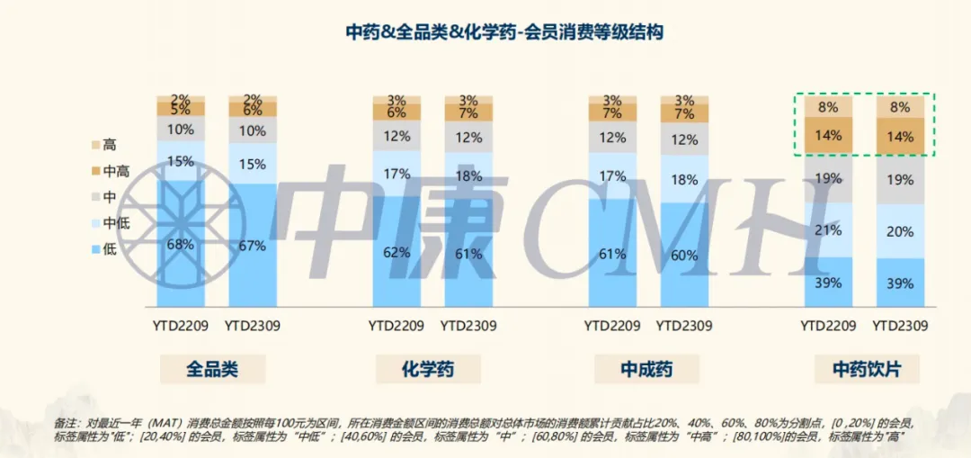 同时,中药亦是药店值得进一步挖掘的引流品种,在“国潮”及“新中式养生”观念的驱动下,中药销售不再局限于中老年客群,也帮助零售药店吸引了年轻客群。中康CMH-小票数据显示,零售药店17-35岁年龄段的中药新会员占比由YTD1909的21%增长至YTD2309的28%,中药在年轻群体的渗透率逐渐提升。值得关注的是,中药更利于药店吸引高质量消费人群,尤其是中药饮片,中高级消费人群占比超20%,明显高于全品类。