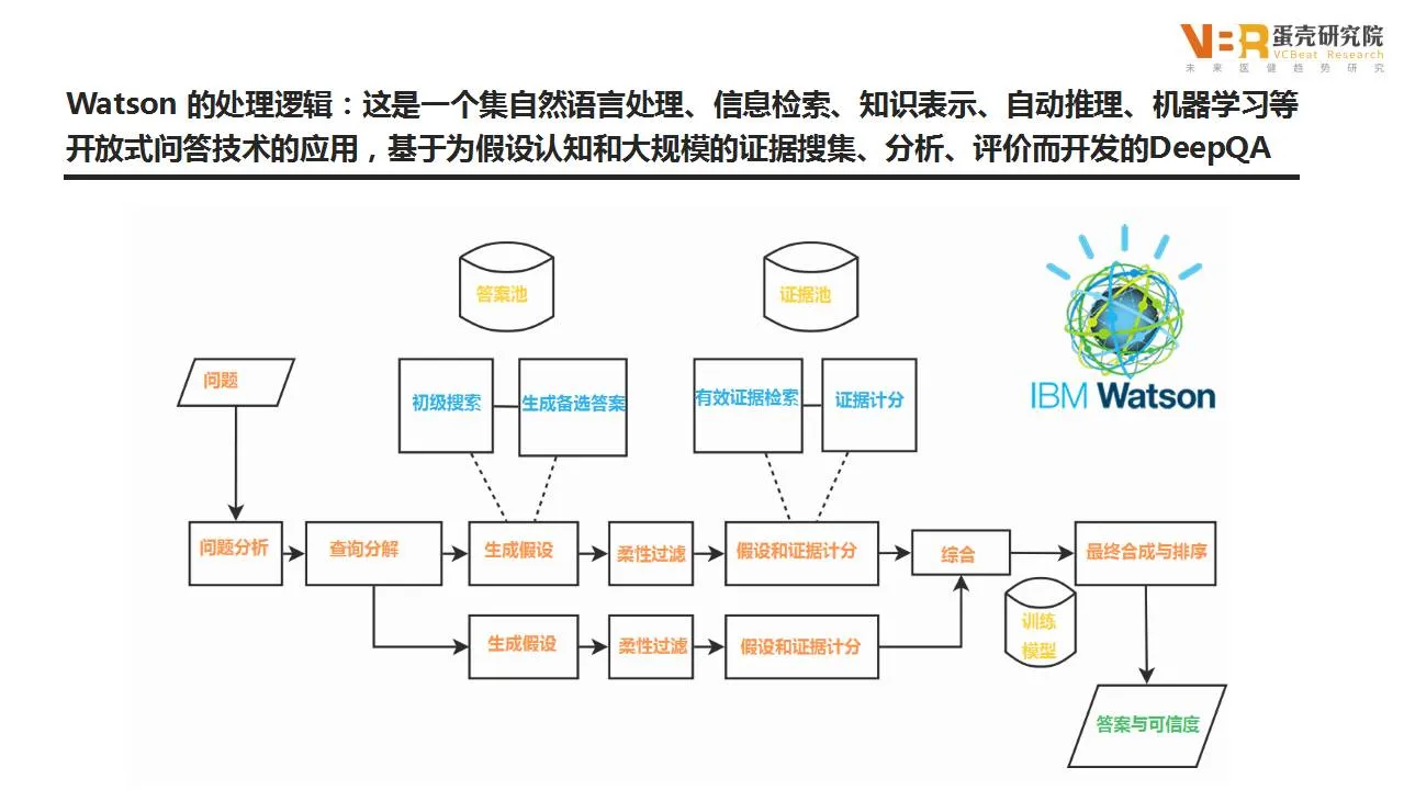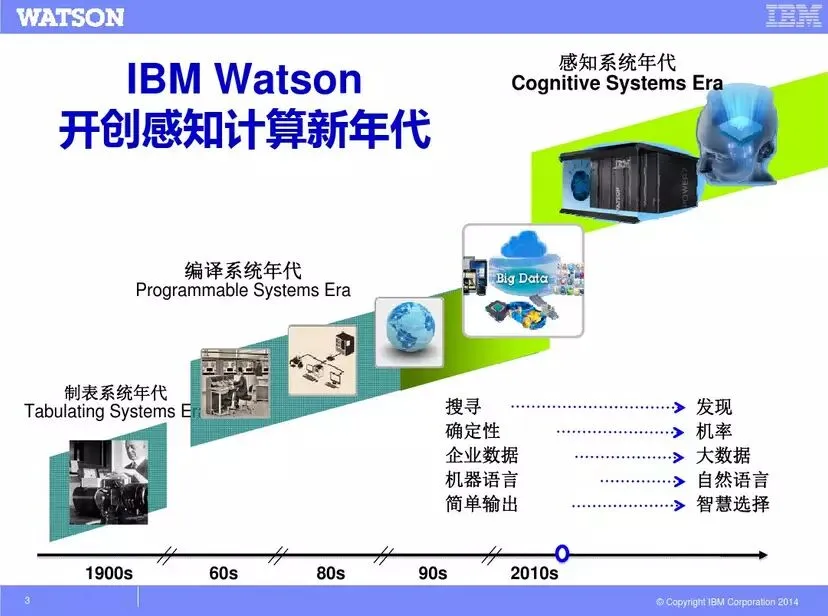 第三个阶段就是2010年以后的认知系统年代。这个代表就是人工智能的出现,譬如拥有“认知计算”能力的Watson。IBM在2006年启动研发Watson,于2014年投资10亿美元成立Watson事业集团,次年便组建了Watson Health,专门针对医疗健康行业提供人工智能认知解决方案。
