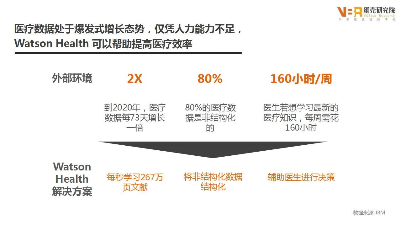 医疗数据处于爆发式增长态势,仅凭人力不足以处理和学习,而Watson Health可以帮助提高医疗效率。IBM判断,在2020年,医疗数据每73天就会翻一番。而且其中80%以上的数据是非结构化的,非结构化数据主要是指那些无法用固定结构来逻辑表达实现的数据,比如视频、音频、图片,对计算机来说不可见的。而Watson可以看到这些数据,并进行深度学习。医生若想学习最新的医疗知识,每周需花160小时,而Watson在15秒内,就可以读取4000万个文件,学习速度非常快。