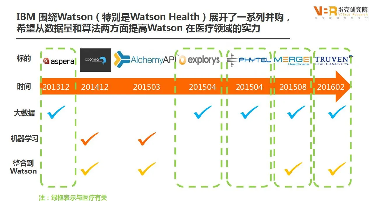IBM Watson的发展,也经历了多宗并购,使其得到技术上的加强。2015年初,IBM宣布收购Alchemy API,这个平台有数万名开发者在利用机器学习算法,做自然语言处理和图片识别,可以改善Watson的生态系统。不久之后,又先后并购了4家医疗数据公司:Phytel、Explorys、Merge Healthcare 和Truven Health Analytics,其中后者的收购价格高达26亿美元。Phytel是开发以云计算为基础的工具来加强健康护理的协调工作和成果,而Explorys是一个基于云技术的数据分析公司。2015年8月,IBM用数十亿美元收购了Merge Healthcare,加强Watson Health。Watson的每一种应用都需要一段时间的预先训练,这也给计算和数据提出了要求。如上所述,IBM的投资和收购都是围绕公司这一长期发展战略而进行,比如收购私有云服务商Blue Box,数据库管理工具Compose,API接口工具StrongLoop,海量数据存储Cleversafe等等,希望从数据量和算法两方面提高Watson在医疗和其他领域的实力。