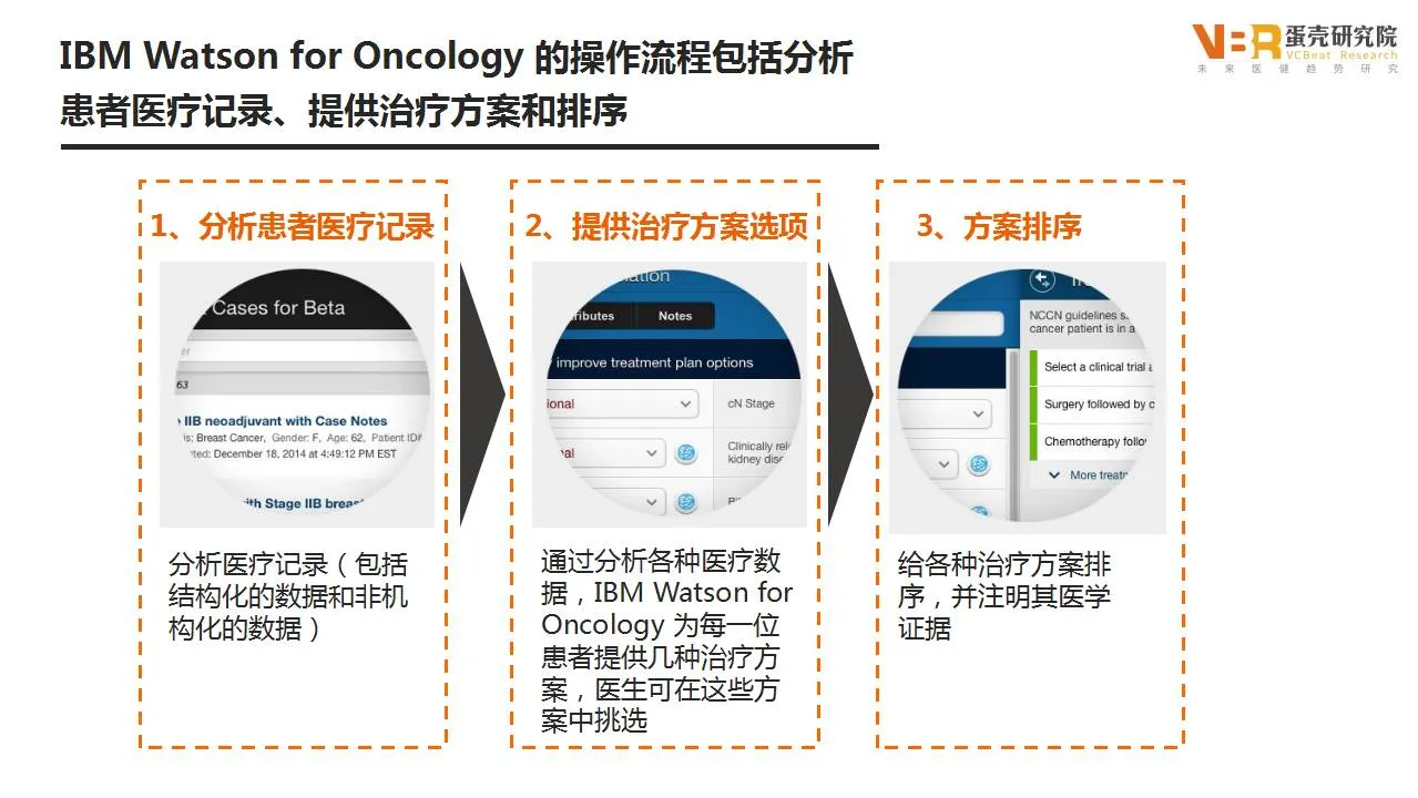 Watson的第一步商业化运作就是在医疗行业,通过和纪念斯隆·凯特琳癌症中心进行合作,得到大量的癌症临床知识、分子和基因组数据、癌症病例历史信息,在该中心进行过“学习”之后,为临床医师提供以证据为基础的治疗方案。随后该系统被Watson Health部署到了许多顶尖的医疗机构,如克利夫兰诊所和MD安德森癌症中心,提供基于证据的医疗决策系统。