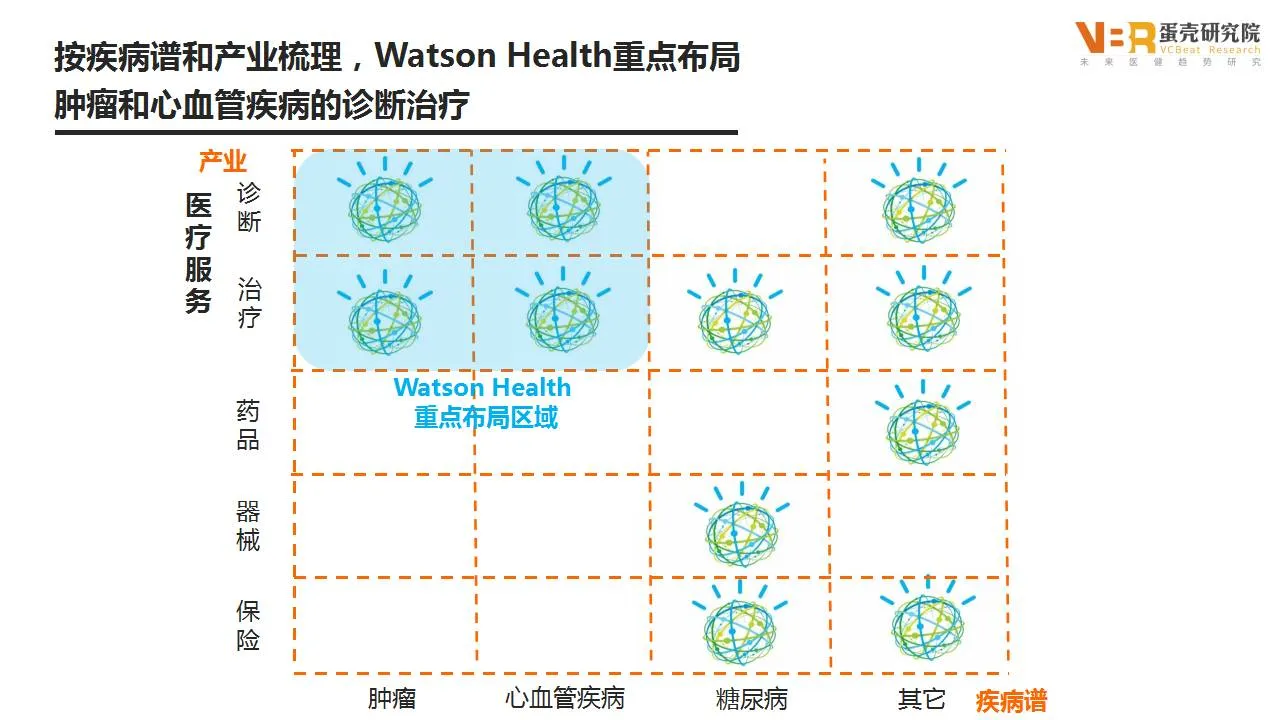 我们梳理了一张IBM Watson的医疗布局图谱,Watson的重点布局是在肿瘤和心血管疾病的诊断和治疗上。其他领域比如糖尿病方面也有涉及,以下是Watson在医疗健康领域中,不同的细分领域所做的一些事情。