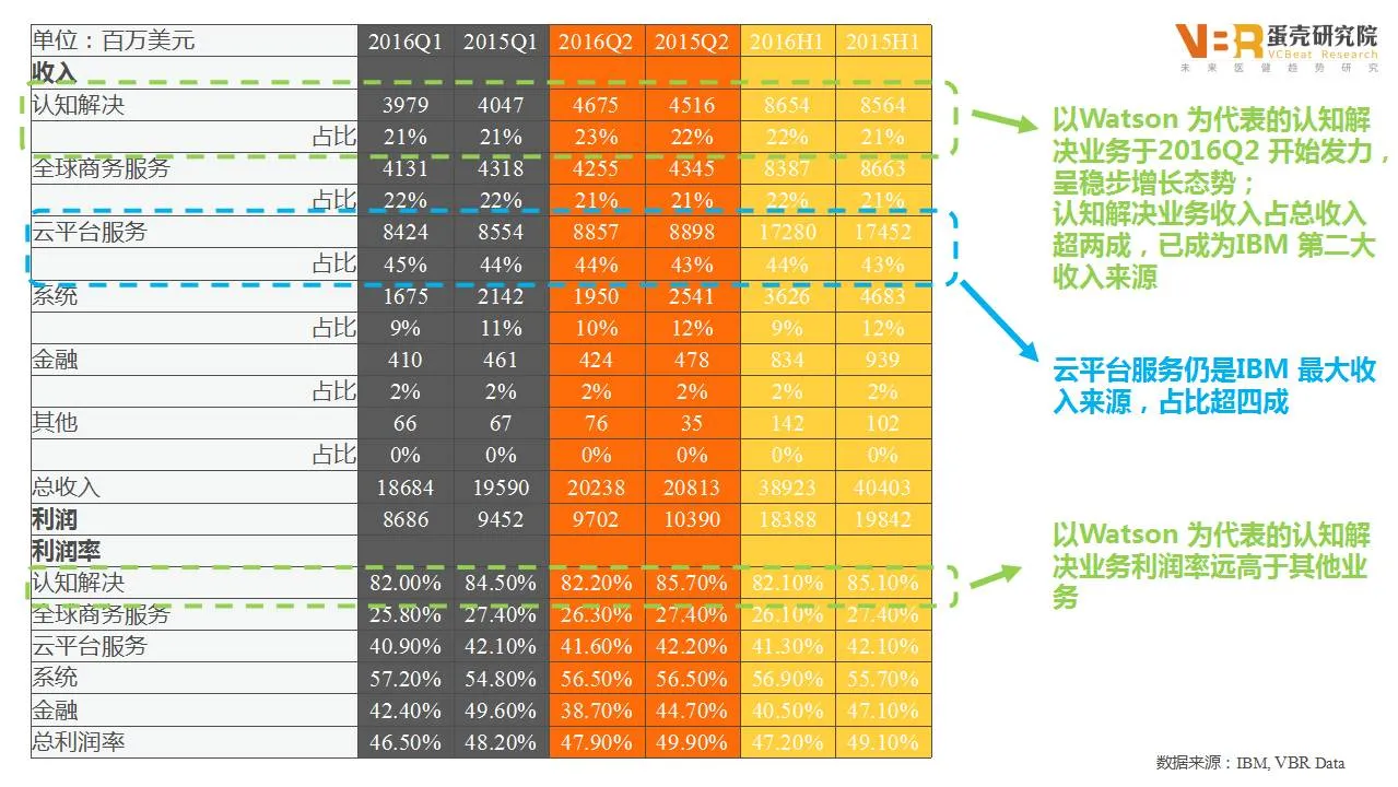 在今年1月的CES上,IBM CEO罗睿兰表示,IBM已经不再是一家硬件或者软件公司,而是一家“认知解决方案云平台”公司。的确,最不赚钱的硬件平台已经最早被IBM处理掉,然后是软件。IBM在之前已经连续15个季度同期相比利润下滑,而Watson智能云平台已经成为IBM盈利的新目标。从今年Q2的财报来看,IBM的总收入为202.38亿美元,低于去年同期的208.13亿美元,已经连续17个季度同比下滑。但是这其中以Watson为代表的认知解决业务于今年Q2 开始发力,呈稳步增长态势,认知解决业务收入占总收入超两成,已成为IBM第二大收入来源。