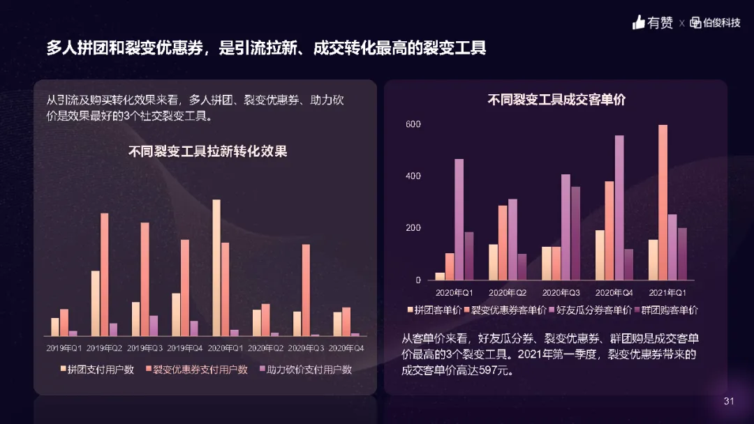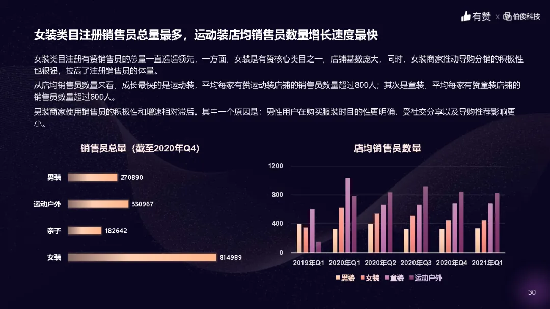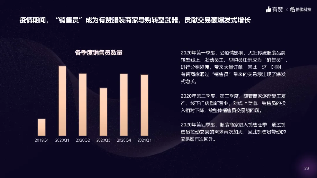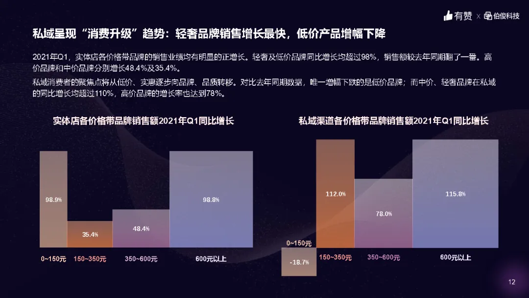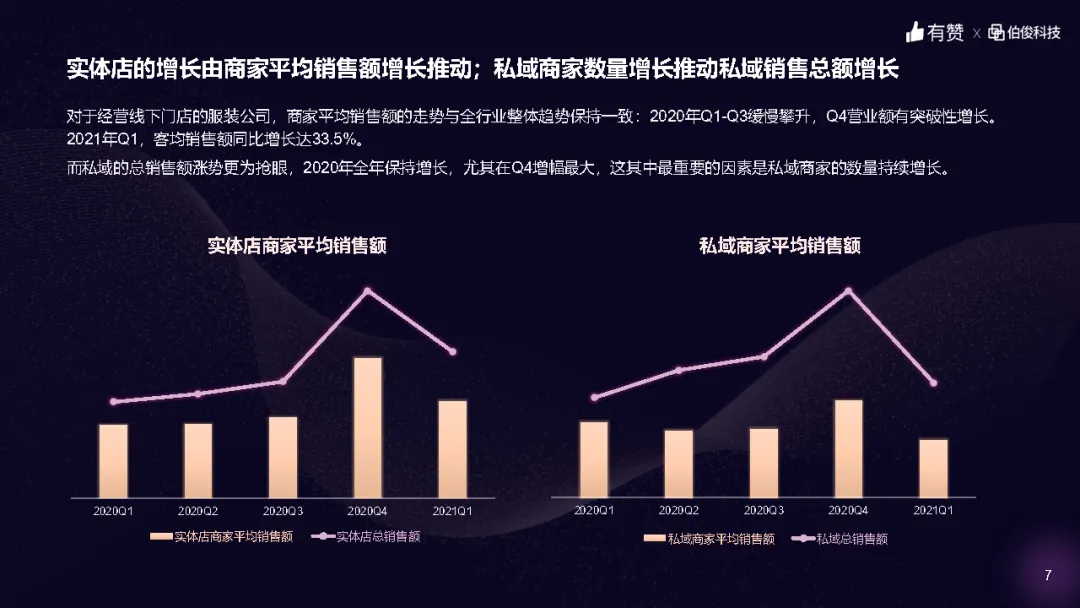 过去一年,对于经营线下门店的服装公司来说,实体店的增长远不及私域总销售额涨势抢眼。后者2020年全年保持增长,尤其在Q4增幅最大,其中最重要的因素是私域商家的数量持续增长。