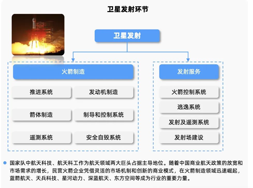 中游环节涉及火箭制造、卫星制造、卫星发射服务以及地面设备的制造,是产业链中的核心部分,承载技术转化与产品实现的目标。