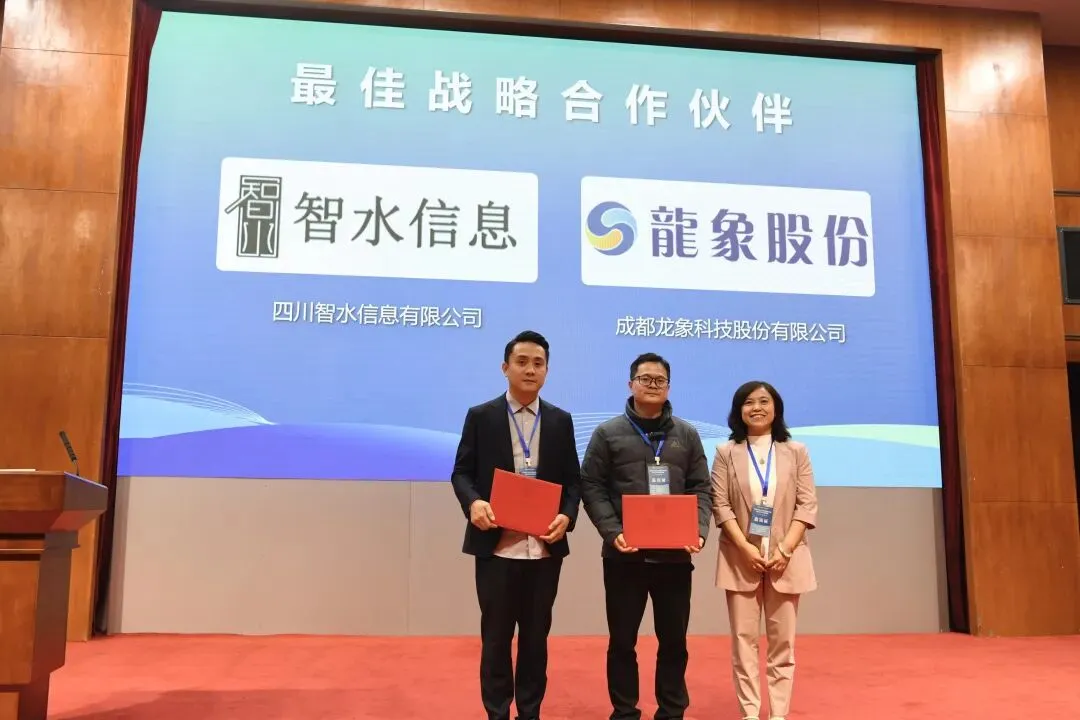 电子科技大学经济与管理学院冯薇教授为四川智水信息有限公司和成都龙象科技有限公司颁发“最佳战略合作伙伴”奖项,感谢其对赛事的大力支持。