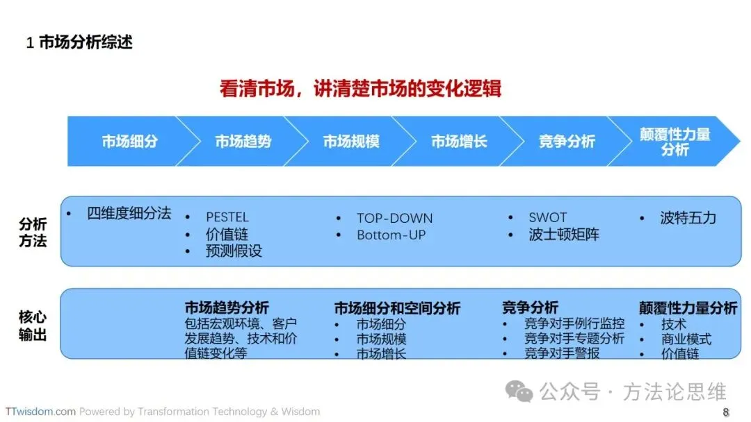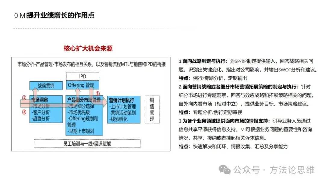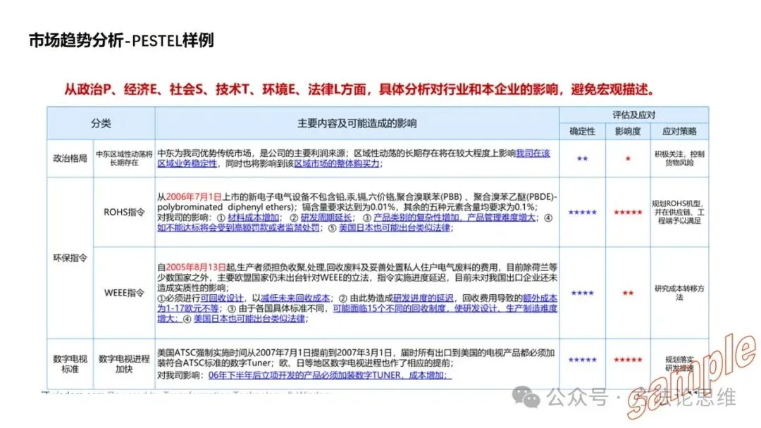 华为通过BLM(业务领先模型)和IPD(集成产品开发)进行市场洞察分析。首先,利用BLM模型进行宏观环境分析,包括政治、经济、社会、技术、生态和法律等方面,以了解市场趋势和机遇。其次,通过IPD模型在产品开发过程中进行市场分析,从客户需求、竞争对手、自身优势和市场机会等方面进行详细分析。最后,结合两者的分析结果,制定相应的市场策略和产品规划,以实现市场成功。