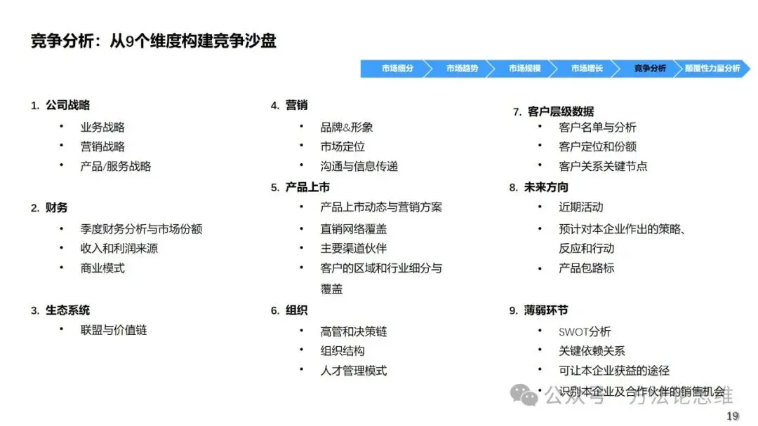 收集数据和信息:首先,埃森哲会从各种渠道收集有关目标市场的数据和信息,包括公开资料、行业报告、企业内部数据等。这些数据涵盖了市场趋势、竞争对手、客户需求、政策法规等多个方面。 进行宏观环境分析:基于收集到的数据,埃森哲会对宏观环境进行分析,包括政治、经济、社会、技术、生态和法律等方面。通过这种全面分析,埃森哲能够了解市场趋势和机遇,为后续决策提供有力支持。 进行市场细分和定位:在宏观环境分析的基础上,埃森哲会对市场进行细分,针对不同的细分市场进行深入研究。同时,根据客户需求和竞争状况,确定企业的市场定位。 分析客户需求:埃森哲会通过市场调查、访谈、观察等方法,深入了解客户的需求和痛点。此外,还会分析客户的消费行为和购买习惯,以更好地满足客户需求。 评估竞争对手:埃森哲会全面评估竞争对手的策略、产品、价格、渠道等方面,以便找出差距和机会。同时,还会密切关注竞争对手的动态,以便及时调整自身策略。 发掘自身优势:在了解市场环境和竞争对手的基础上,埃森哲会发掘企业的优势和特点,如技术优势、品牌优势、成本优势等。通过发挥自身优势,埃森哲可以在竞争激烈的市场中脱颖而出。 制定市场策略:最后,埃森哲会根据以上分析结果,制定相应的市场策略和产品规划。这有助于企业实现市场成功,为业务发展提供持续动力。