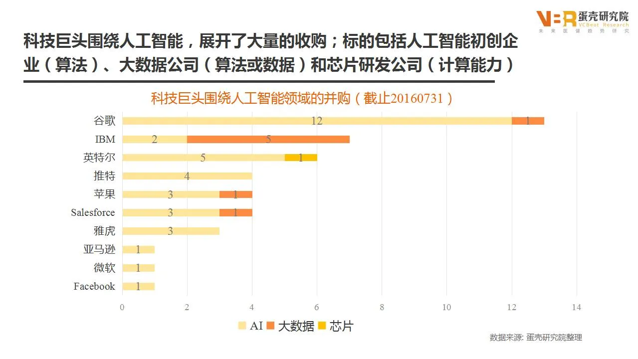科技巨头围绕人工智能产业,开展了大量的收购;标的包括人工智能初创企业(算法)、大数据公司(算法或数据)和芯片研发公司(计算能力)。截至至2016年7月底,谷歌在其中的收购次数最多达到了13次。巨头们在人工智能领域的并购呈现两个特点:一是连续多次买入,二是标的规模较小。