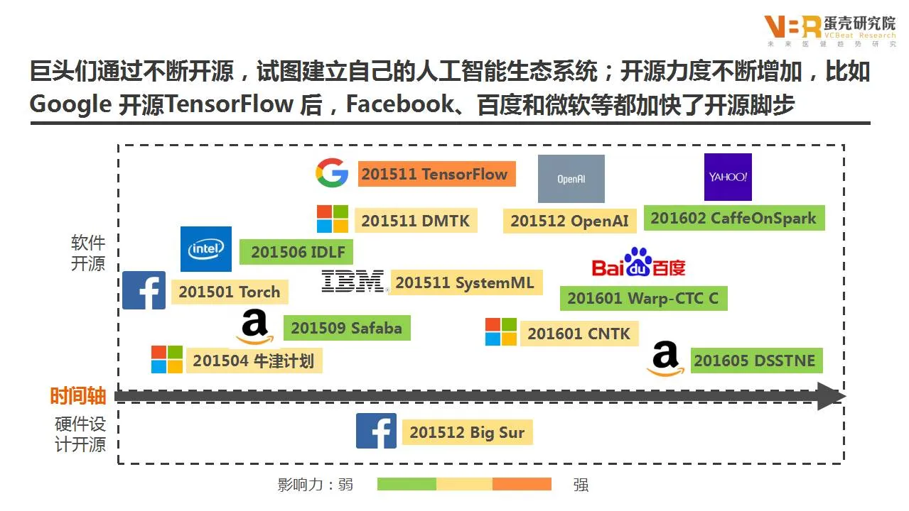 从2013年开始,科技巨头大多加大了对人工智能的自主研发,同时通过不断开源,试图建立自己的人工智能生态系统,开源力度不断增加。比如Google 开源TensorFlow 后,Facebook、百度和微软等都加快了开源脚步。最早走向人工智能工具开源的是社交巨头Facebook,于去年1月宣布开源多款深度学习人工智能工具。而谷歌、IBM和微软几乎于去年11通同时宣布开源。谷歌发布了新的机器学习平台TensorFlow,所有用户都能够利用这一强大的机器学习平台进行研究,被称为人工智能界的Android。IBM则宣布通过Apache软件基金会免费为外部程序员提供System ML人工智能工具的源代码。微软则开源了分布式机器学习工具包DMTK,能够在较小的集群上以较高的效率完成大规模数据模型的训练,在今年7月微软又推出了开源的Project Malmo项目,用于人工智能的训练。