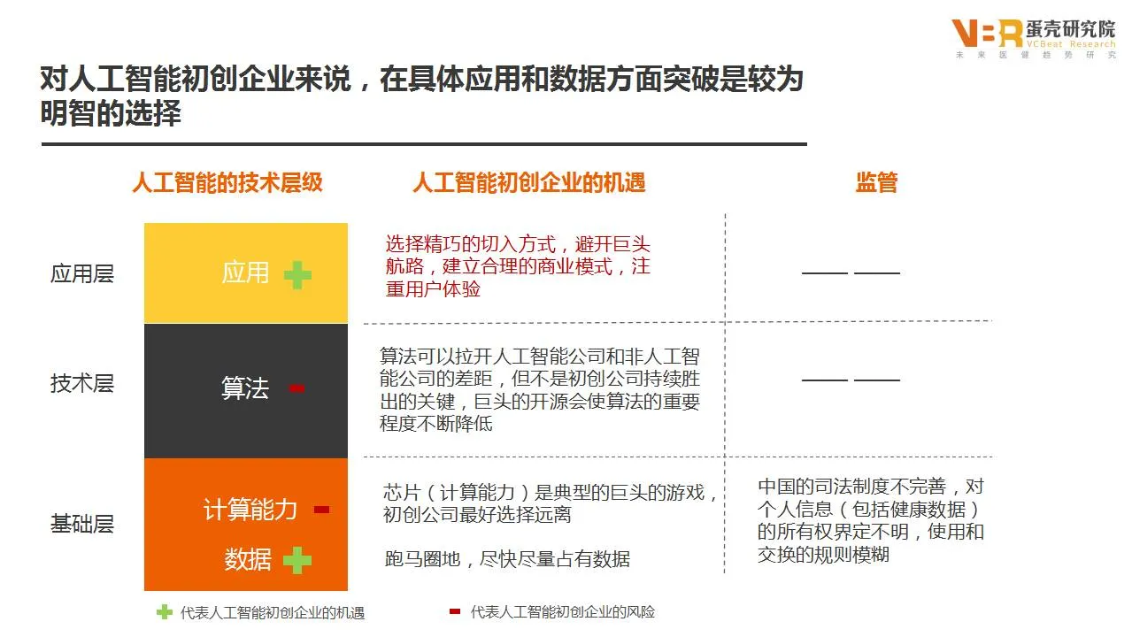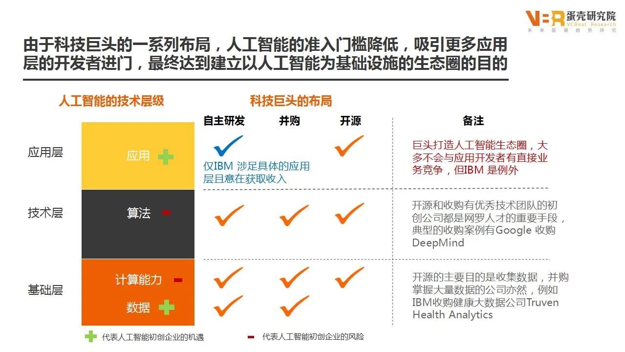 位于基础层的企业一般是典型的IT巨头,拥有芯片级的计算能力,通过部署大规模GPU和CPU并行计算构成云计算平台,解决人工智能所需要的超强运算能力和存储需求,初创公司无法进入。技术层的算法可以拉开人工智能公司和非人工智能公司的差距,但是巨头的逐步开源使算法的重要程度不断降低。应用层是人工智能初创企业最好的机遇,可以选择合理的商业模式,避开巨头的航路,更容易实现成功。