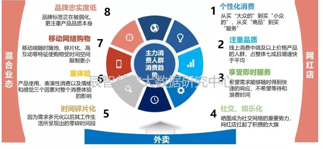 面临主力消费人群消费趋势的变化,餐饮业催生一些新的发展趋势,主要包括混合业态、外卖和网红店。